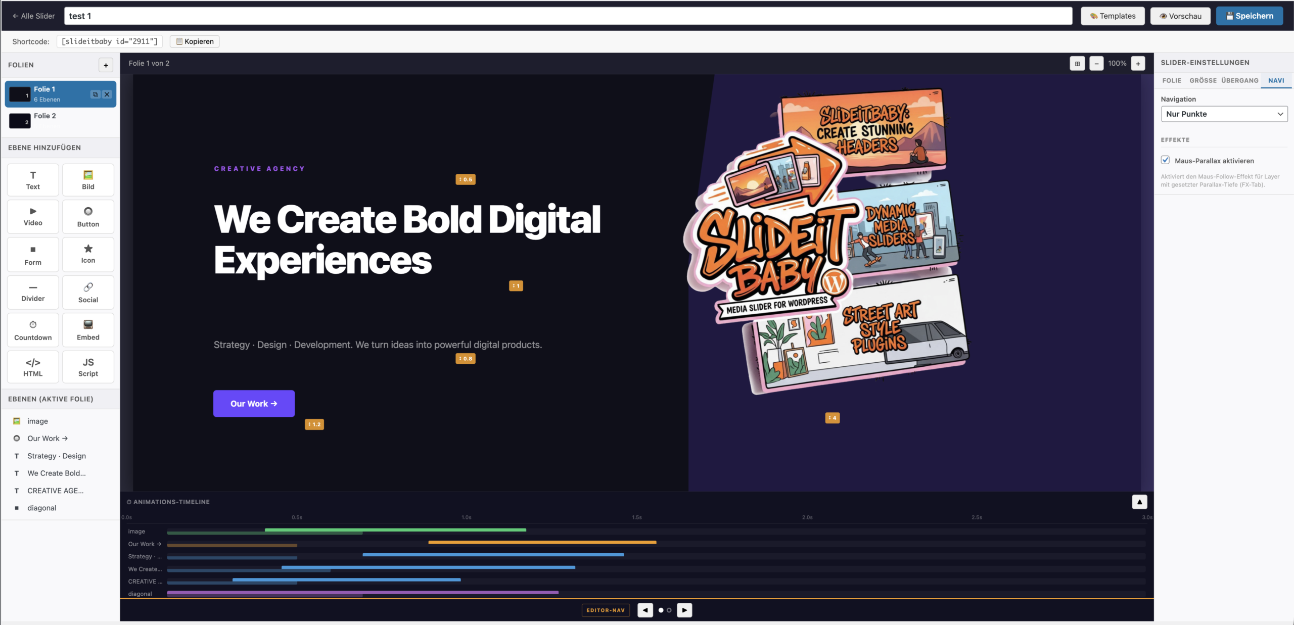 Slide-It-Baby ist ein moderner WordPress Media-Slider für auffällige Header, dynamische Slides und kreative Content-Präsentationen – mit Icon-, Divider-, Social-, Countdown- und Video-Layern, erweiterten Animationen, Scroll-Triggern und responsiven Layer-Einstellungen.